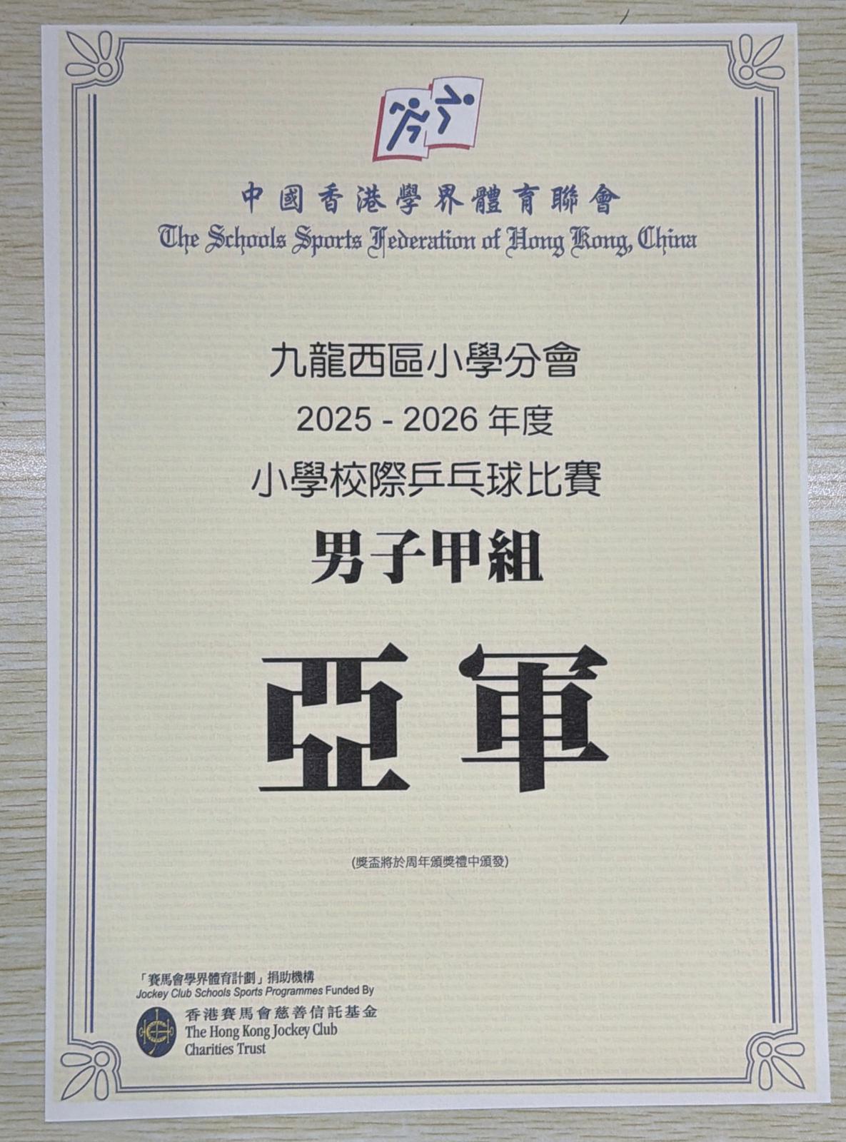 2025 – 2026年度九龍西區小學校際乒乓球比賽 聖方濟各英文小學 (男子甲組) 亞軍